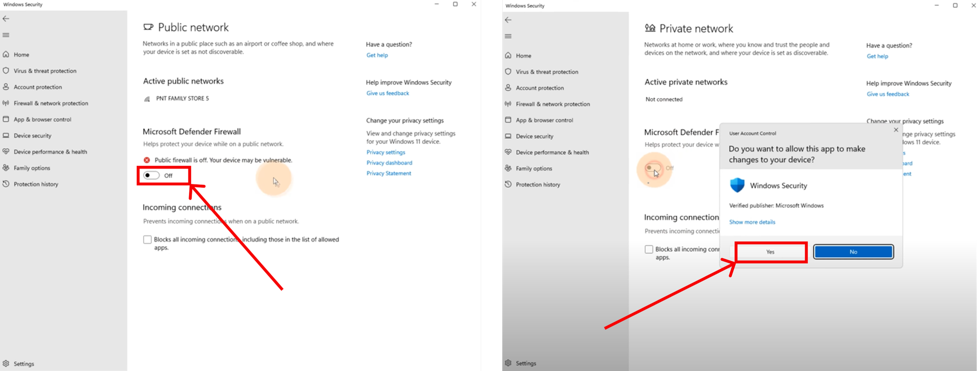 c.Click each network type’s blue name and toggle the slider to turn off the firewall.When prompted to confirm the change, select the Yes option (white button).