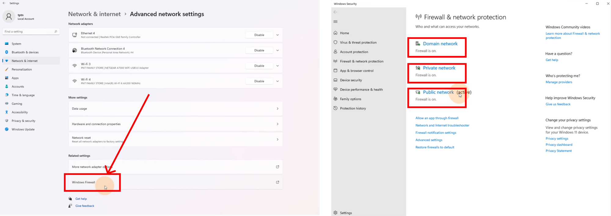 b.Find Windows Firewall, where you’ll see three network types: Domain, Private, and Public.