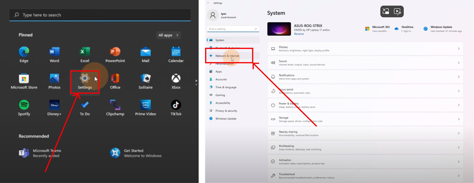 a.Click the Start button, then select Settings and go to Network & Internet.