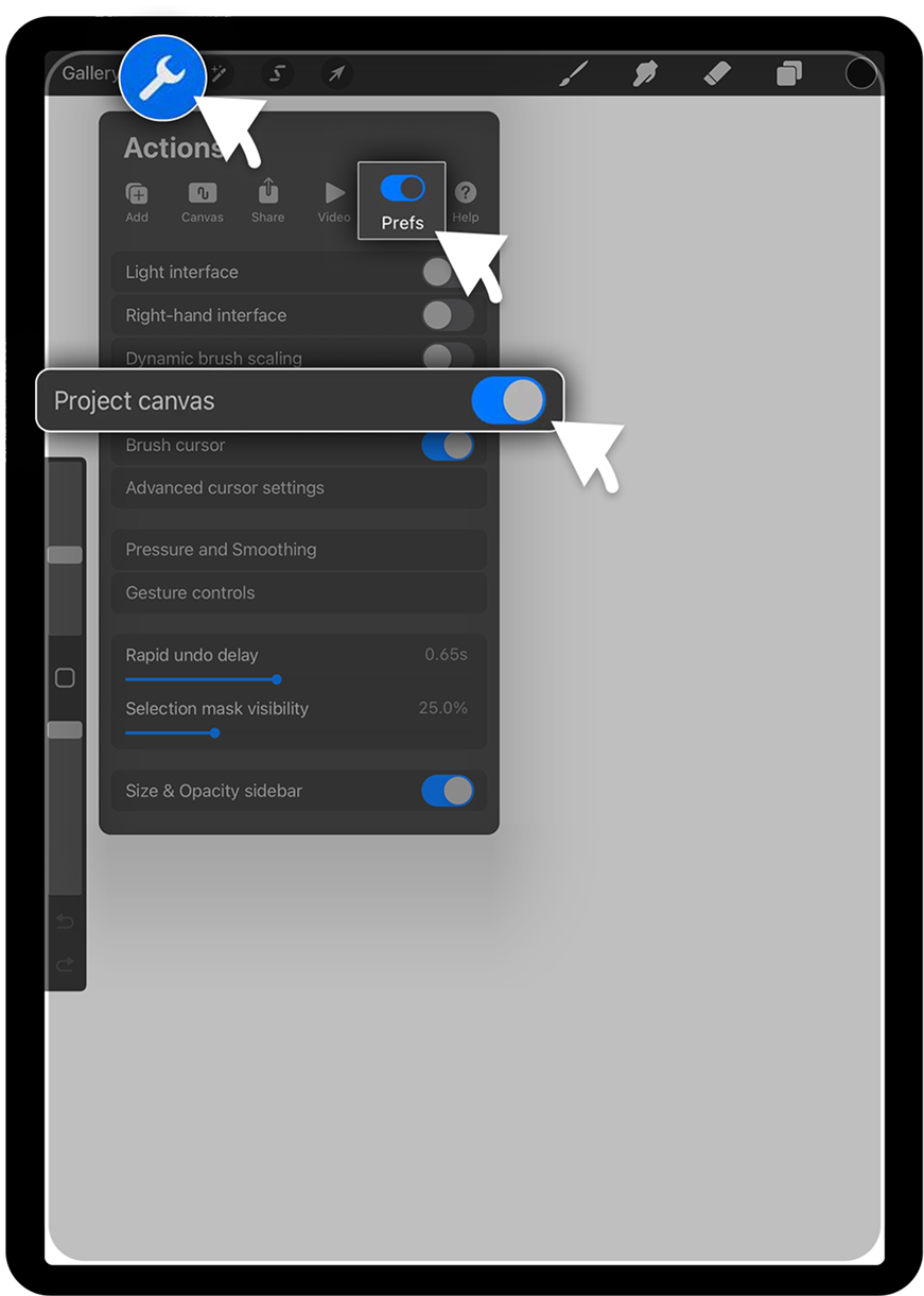 Then open Procreate on your iPad. Tap "the wrench icon" in the top-left corner, select "Prefs", and enable "Project Canvas".