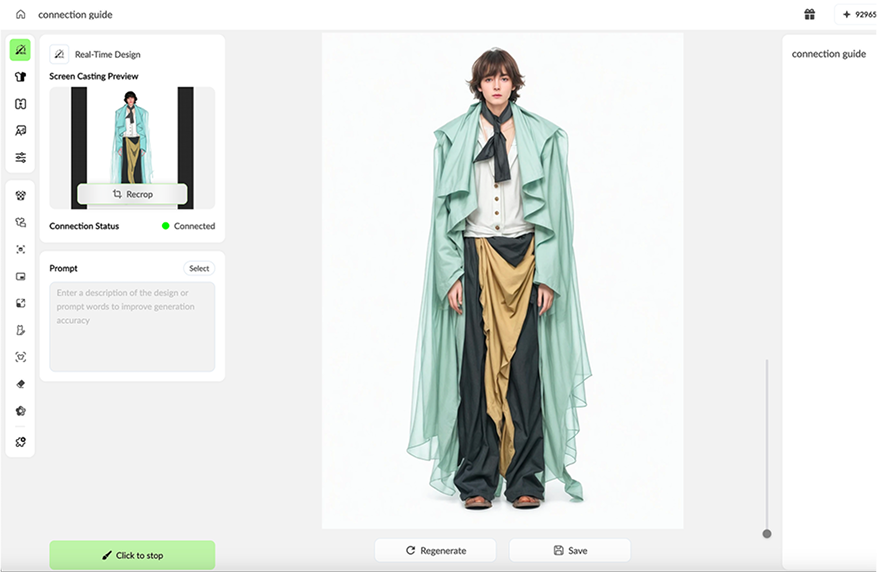 Select Real-Time Design from the left toolbar to activate the AI sketch generator. Instantly turn hand-drawn sketches into professional garment renderings