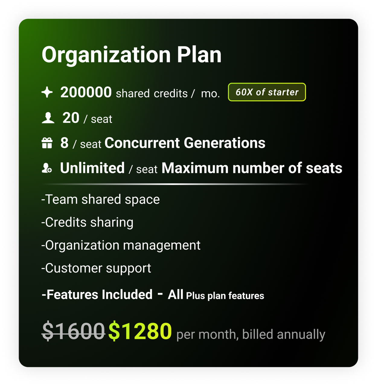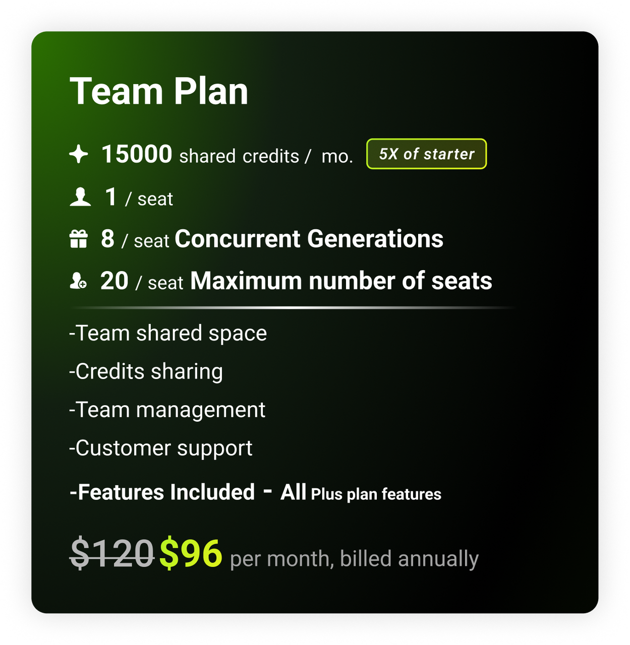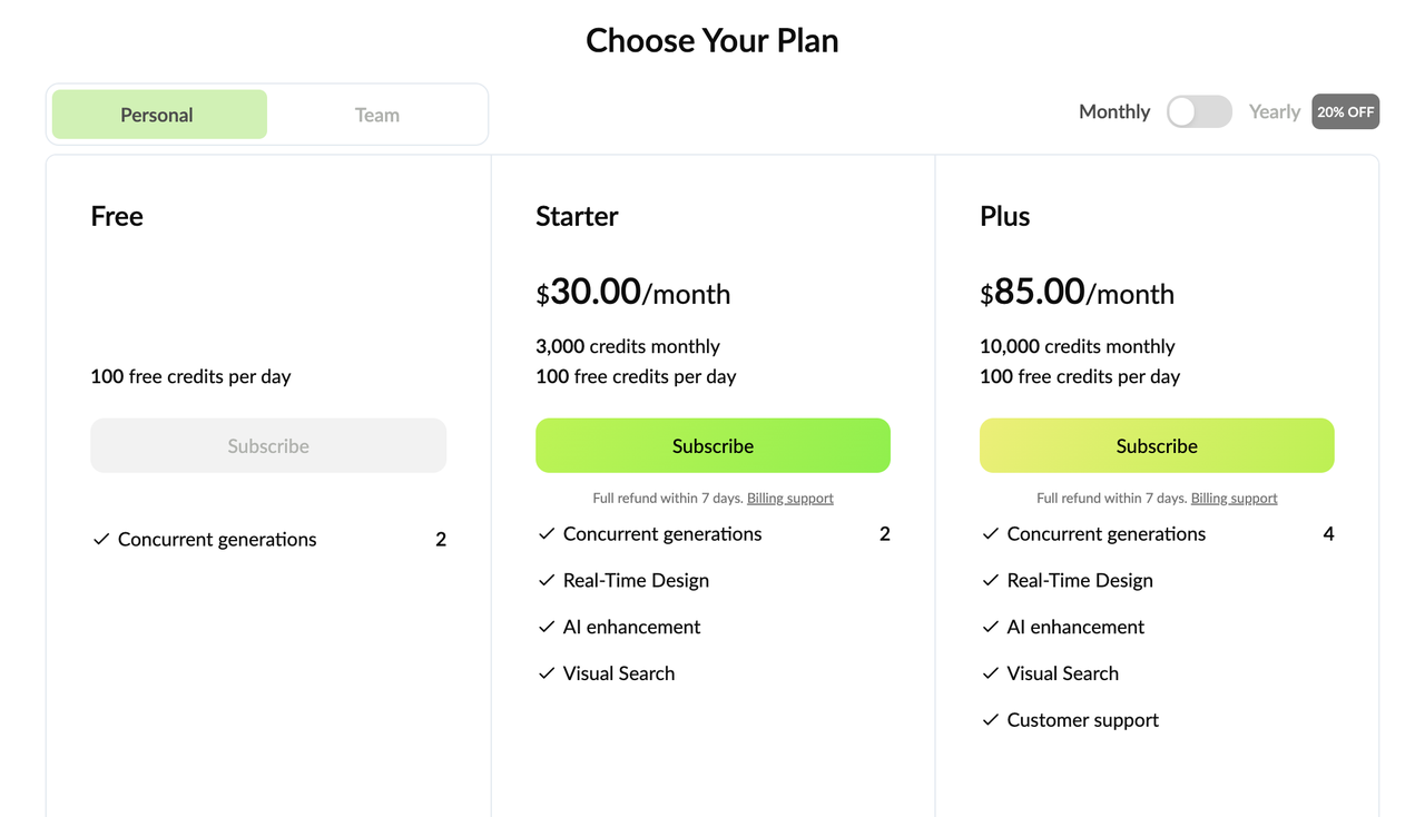 No more designing alone. Team plan would allow maximum 20 seats within the same team space. All seats can share credits within the team.Would you like to know what's even better? Each seat can generate up to 8 assets concurrently, which would allow maximum design efficiency.Starts at $120 per month. Enjoy 20% off if you commit to an annual plan.